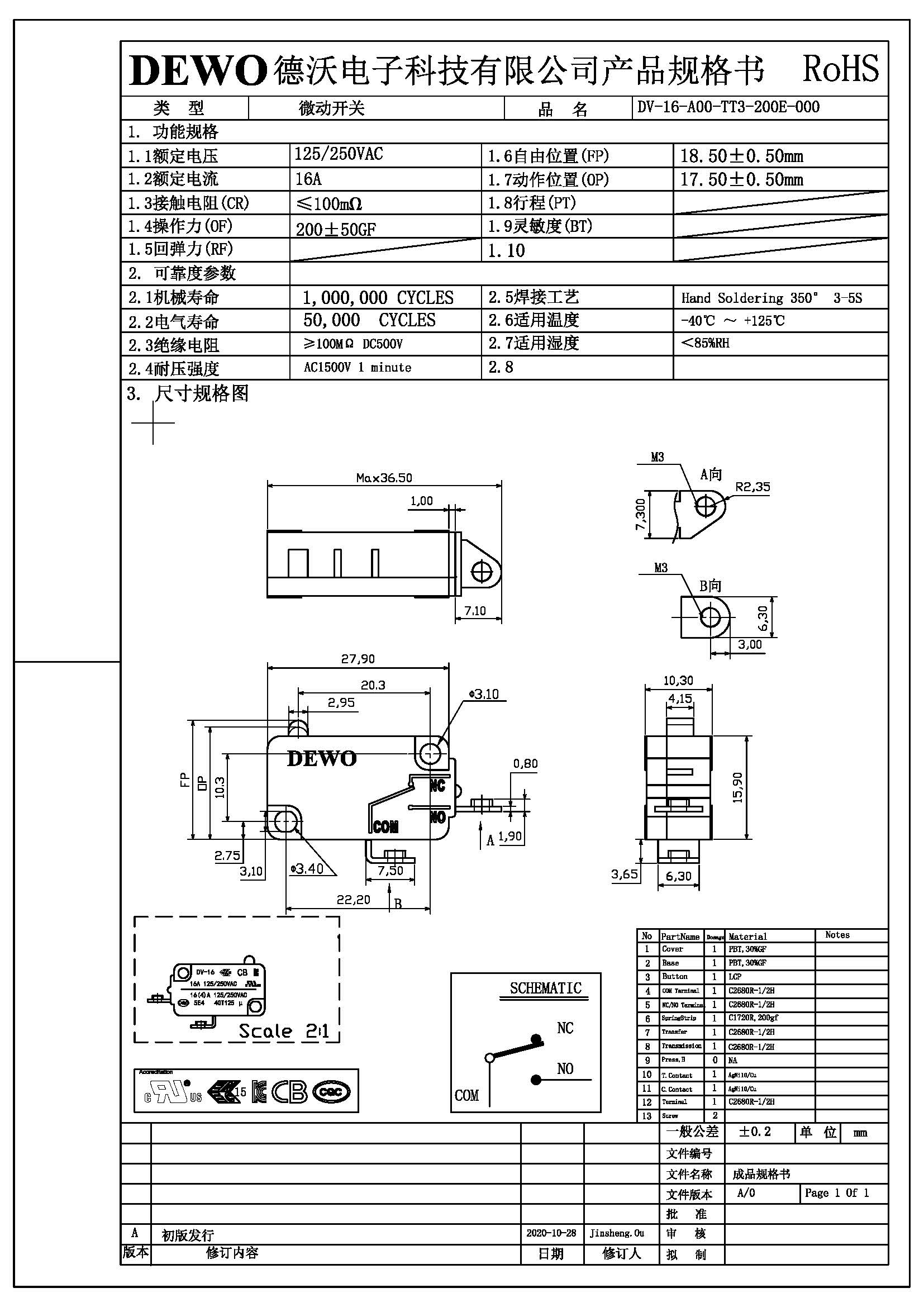 DV-16-A00-TT3-200E型微動(dòng)開關(guān)
