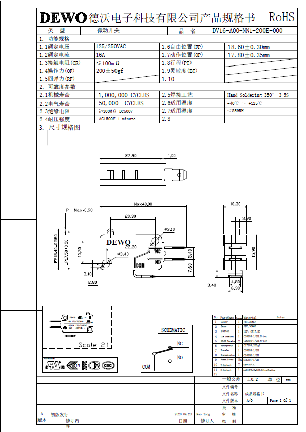DV-16-A00-NN1-200E型微動(dòng)開關(guān)