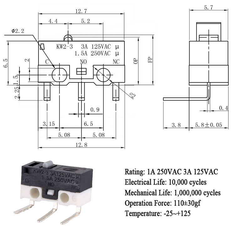 KW2-3-00CL-110-5小型微動(dòng)開關(guān)側(cè)彎端子